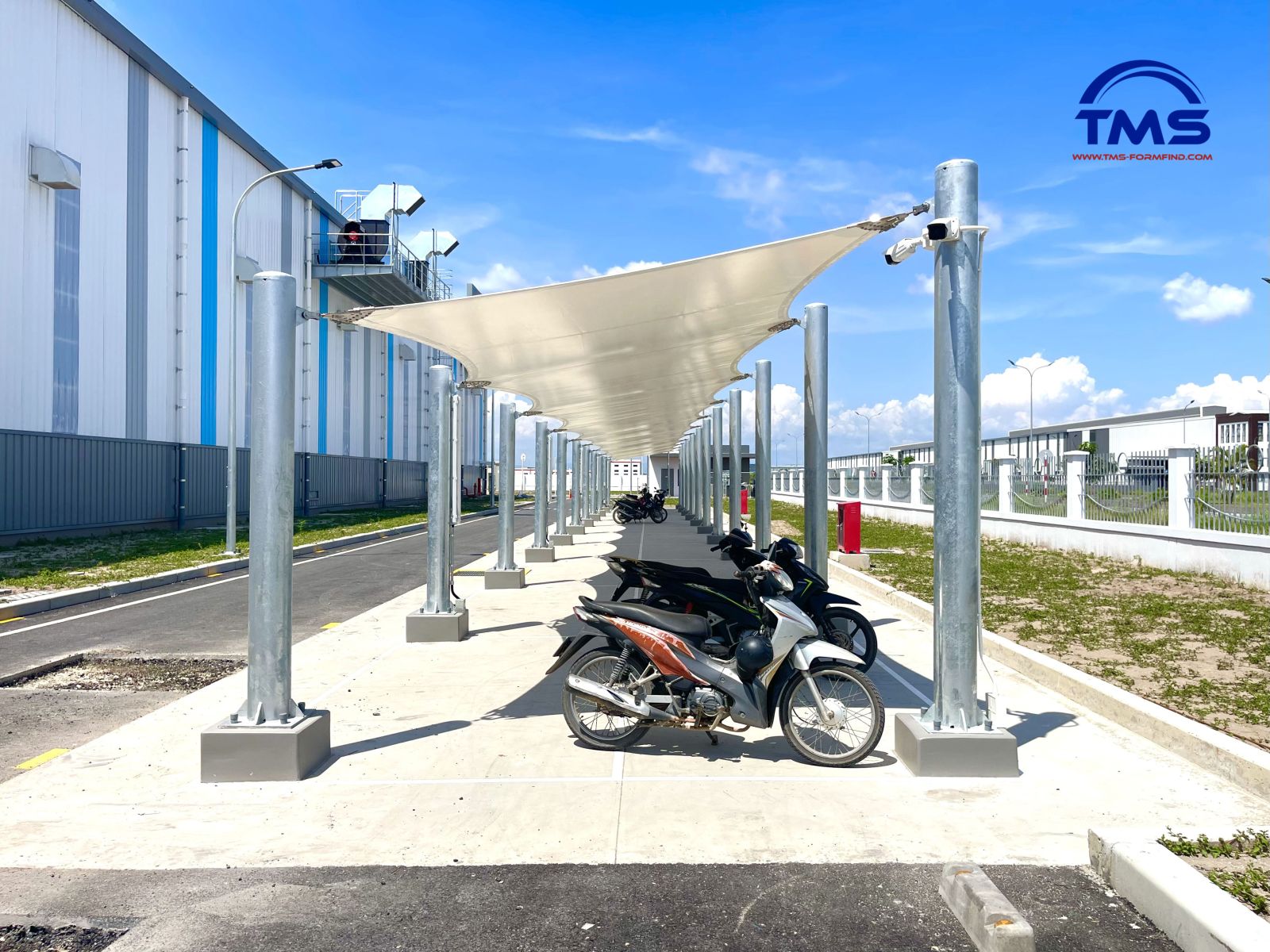 Dự án mái che bãi đỗ xe diện tích 2.467m² sử dụng vật liệu PVC Sioen Bỉ với thiết kế cánh bướm. Đây là một trong những dự án quy mô lớn nhất của TMS, thể hiện năng lực thi công cho các công trình công nghiệp có yêu cầu kỹ thuật cao.